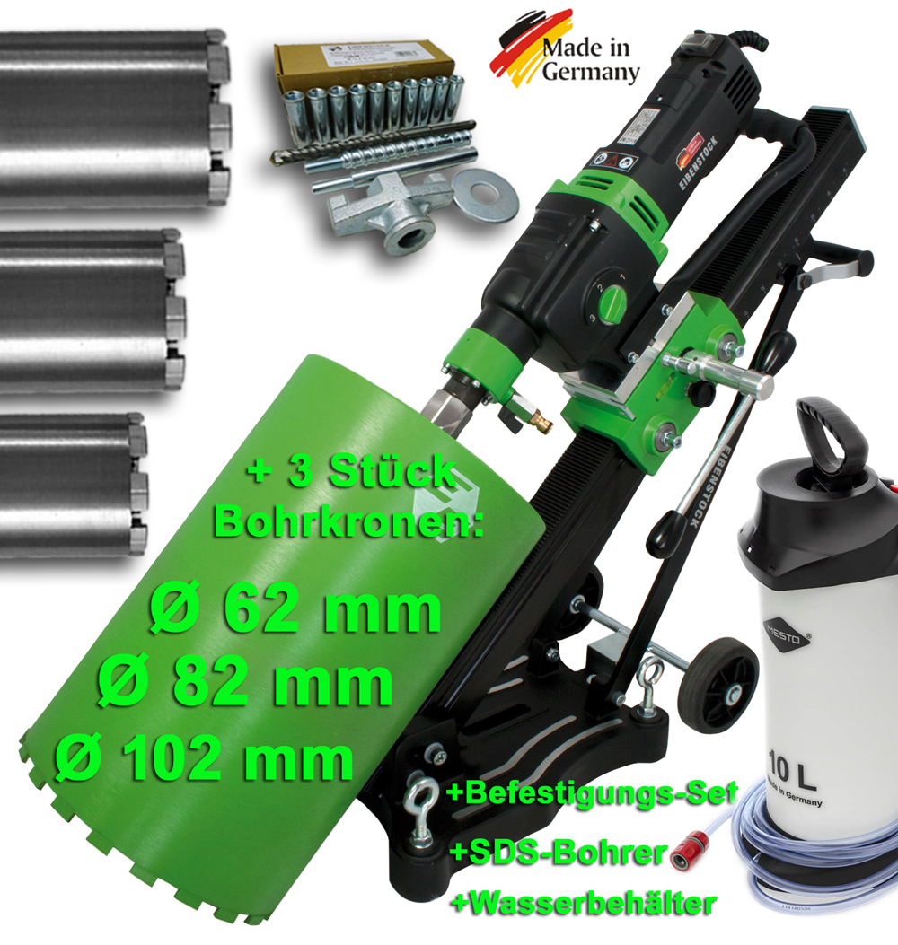 Bohrständer + Bohrmotor + 3x Profi-Bohrkrone 62 + 82 + 102mm, Wasserbehälter Kunststoff sowie Befestigungsset incl. 10 Dübel für Beton+ SDS Bohrer Ø 16 + Maulschlüssel SW 41