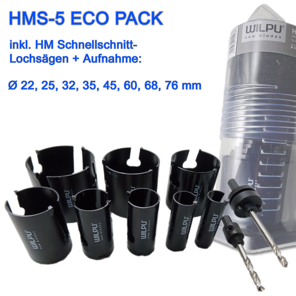 Wilpu HM Lochsägenset HMS-4-Eco Pack 10-tlg. für alle Holzarten und Gasbeton, Inhalt: Ø 22, 25, 32, 35, 45, 60, 68, 76 mm + Halter ZEB4B +Halter ZE2 (11 mm sechskant) Schnitttiefe 60 mm